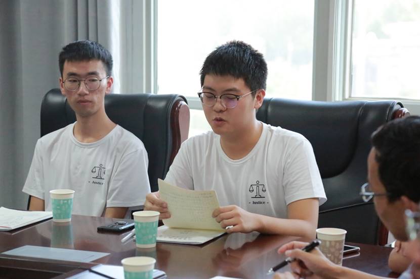 其次发言的是金明区院的邱泽昱、杨阳、霍睿博同学的发言,他们在实习中对于案卷已经非常熟悉,经常向孙科长汇报看卷成果,也经常得到孙科长的指点,在这过程中他们深刻认识到自己的不足,同时在一次次汇报学习中不断进步。特别地,他们与公诉科的检察官们进行了一次模拟法庭的辩论,表现不俗,得到了孙科长的充分肯定。孙科长同时提到,卷宗的重复阅读对于办案人员来说是极其基础且重要的一个环节。对卷宗的绝对熟悉有利于案件的展开。孙科长肯定了同学们发现问题的独到眼光与完成任务的认真态度,同时认为大学生身上也有在职检察官们值得学习的地方,给予了同学们高度评价。魏主任则送给在座同学们三句话,一是给自己一个准确的人生规划,而是给自己一个明确的目标追求,三是对自己有一个正确的心态分析。