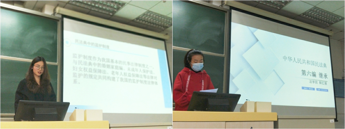 此外,本次班会还增加一项具有法学院特色的议程。为深入学习宣传《中华人民共和国民法典》,努力营造尊法、学法、守法、用法的浓厚法律氛围,法学院早先组成民法典宣讲团,助力班集体、各支部学习民法典。在班会上,研究生会组织民法宣讲团讲师王垚和解红展进行民法典试宣讲,一方面加深同学们对民法典的认识理解,一方面也对宣讲团成员提出进一步改进的建议。