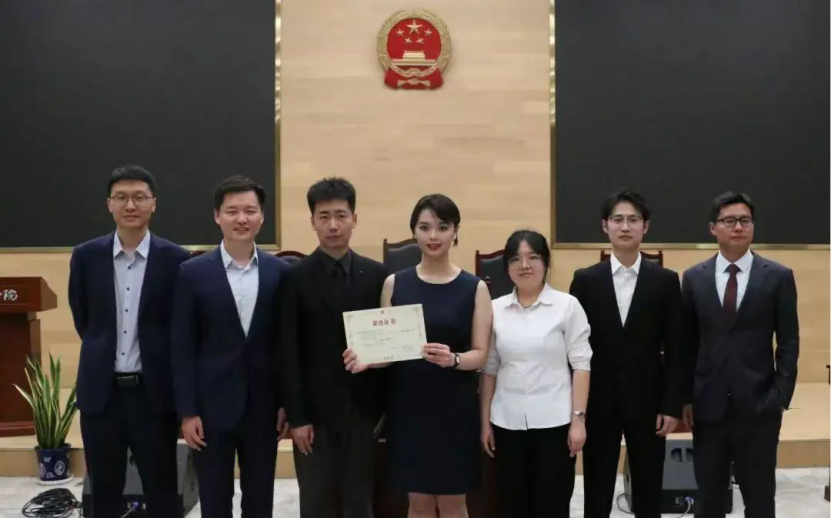 研究生赛队成员与评委合影(左起:周子告律师、张辰扬律师、修宇、利思烨、周宏宇、马晓宇、徐经纬律师)